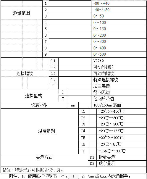 選型須知:請提供型號、表盤直徑、精度等級、安裝固定形式、測溫范圍、控頭長度或插入深度。