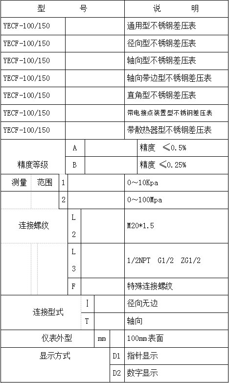 不銹鋼差壓表選型表:
