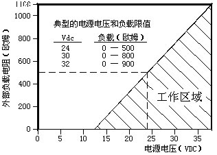 最大可接入的環路電阻取決于供電電壓,下表詳細說明了不同電壓情況下,可接入的最大負載電阻: