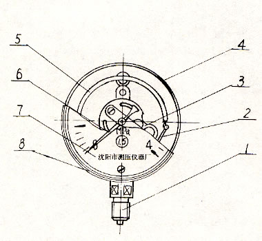 1.接頭   2.連桿  3.傳動機構  4.表殼  5.彈簧管  6.指針  7.度盤  8.罩圈