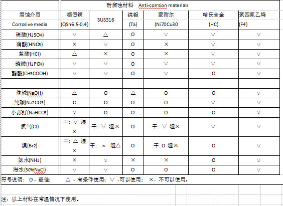 隔膜壓力表是由膜片隔離器、連接管和通用型壓力表三部分組成,并根據被測介質的要求在其內腔充填適當的工作液。膜片材料如下表: